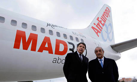 El presidente de la Comunidad de Madrid, Ignacio González, presentó hoy la campaña de promoción turística que el Gobierno regional lleva a cabo con la compañía aérea Air Europa y que mostrará los atractivos de Madrid a más de cuatro millones de pasajeros. Dentro de esta campaña, hoy se presentó el primer avión de la aerolínea que exhibirá en su fuselaje el eslogan que la Comunidad de Madrid emplea en sus acciones promocionales internacionales: Only in Madrid.Ignacio González, junto con el presidente de Air Europa, Juan José Hidalgo, y la directora general del Aeropuerto Madrid-Barajas, Elena Mayoral, presentaron hoy esta campaña turística en un Boeing 737-800, con capacidad para 175 pasajeros, en las pistas de la Terminal 3 del aeropuerto madrileño.